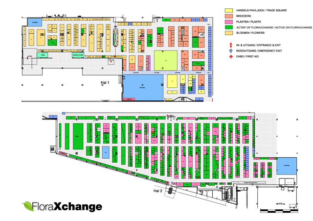 De stands van de kwekers die actief zijn op FloraXchange zijn op de plattegrond van de Trade Fair (zie onderstaand) groen gekleurd.