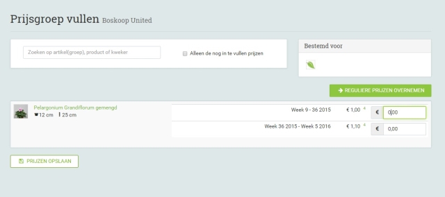 Nadat de beschikbaarheid van het product is doorgevoerd in FloraXchange moeten de prijzen voor FloraXchange Services ingevuld worden. Om de prijzen voor FloraXchange Services in te kunnen vullen ga je in het menu aan de linkerkant naar 'aanbod' en klik je op 'termijnaanbod'. Op de pagina termijnaanbod zie je verschillende prijsgroepen. Om de prijzen voor FloraXchange Services te kunnen vullen, klik je bij de prijsgroep 'FloraXchange Services' op het euroteken aan de rechterkant. Als je op het euroteken hebt geklikt zijn alle producten die je aan FloraXchange Services hebt gekoppeld zichtbaar zodat je op één pagina de prijzen van alle producten kan vullen.