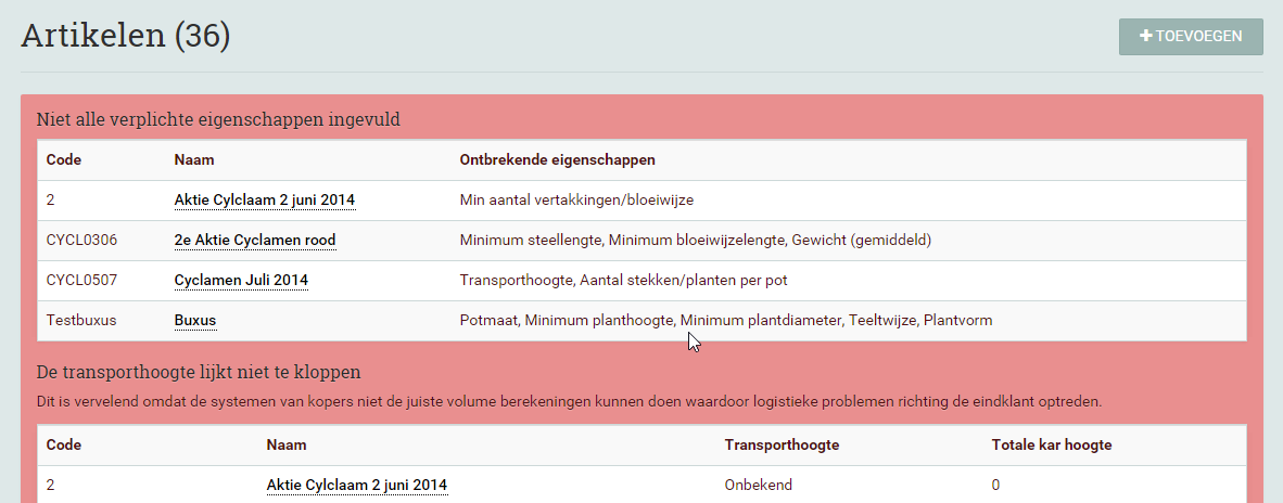 Sommige systemen kunnen niet omgaan met VBN producten die volgens Floricode reeds verlopen zijn. Ten tijden van ingeven bestonden deze nog maar in de tussentijd zijn ze verlopen. Deze artikelen zullen aangepast (of opnieuw aangemaakt) moeten worden.