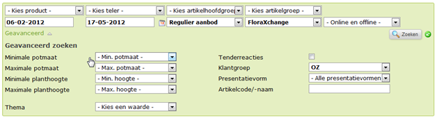 Vul in het filter alvast de gewenste waarden in (Periode, Aanbiedingstype, Webshop en Klantgroep). Bij de webshop kies je voor FloraXchange omdat deze de verspreiding van aanbod regelt.